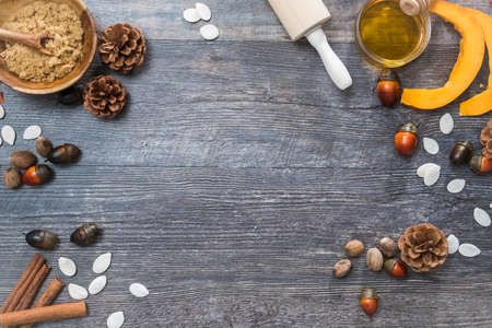 Ingredients for preparing pumpkin pie on wooden background