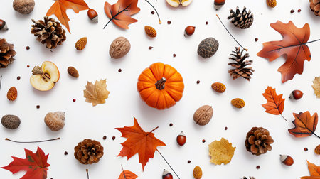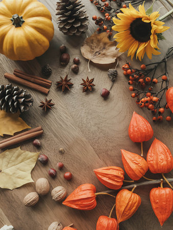 Autumnal decoration flat lay top view, fall season pattern as background