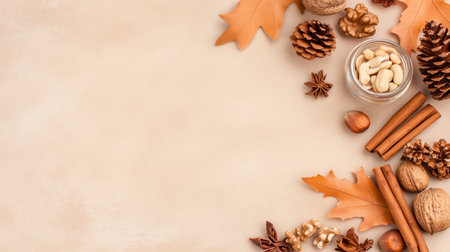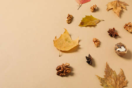 Minimal fall layout with dry leaves and fruitage such as nuts, cinnamon, acorns and chestnuts on pastel beige background. Creative fall season concept. Natural vintage autumn pattern or texture.