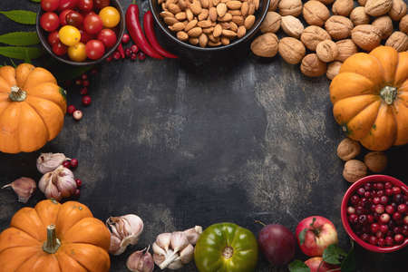 Fall autumn harvest thanksgiving holiday concept. Pumpkin apple chestnut corn nuts grapes, ripe fruit and vegetables on a black table. Copy space background