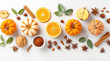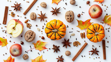 Seasonal baking flat lay with pumpkins, apples, nuts, and spices on white background, top view
