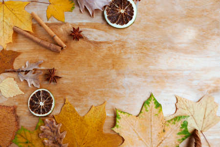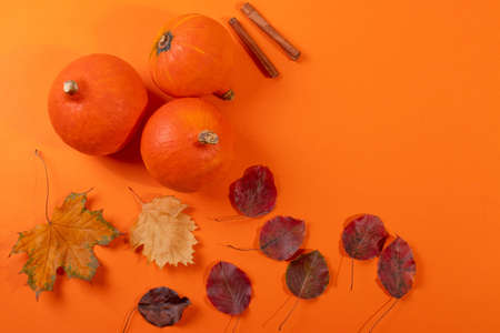 Multicolored leaves pumpkins and spices. Creative autumn layout.