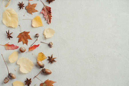 Autumn leaves, pumpkin, pine cones and flowers on gray background with copy space. Thanksgiving concept. Flat lay, layout, room for text