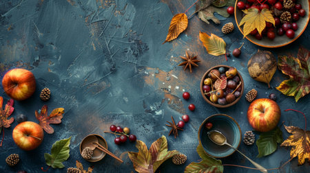 A rustic autumn-themed flat lay featuring apples, leaves, berries, and spices on a dark textured background. Ideal for seasonal, harvest, and culinary themes.