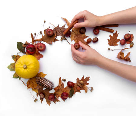 Hands of child who make autumn composition from leaves of pumpkin and chestnuts