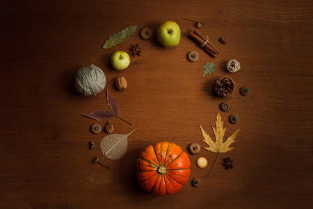 autumn themed layout of pumpkins, apples, dried leaves on a dark wooden background, in the shape of a circle. top view
