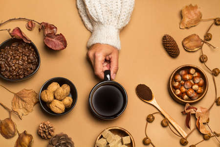 Woman holding a cup of black coffee on brown background in a top view