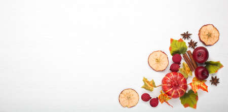 Pumpkins, autumn leaves, anise, acorns, cinnamon on white wood. Autumn background flat lay with space for text. Happy Thanksgiving template. Hello Fall