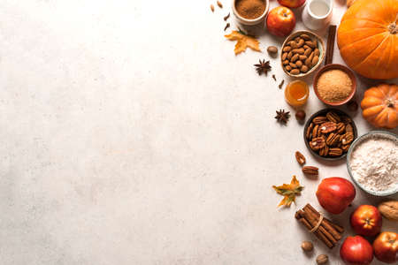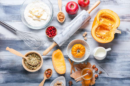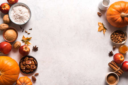 Autumn fall baking food background with pumpkins, apples, nuts and seasonal spices on white. Cooking pumpkin or apple pie and cookies for Thanksgiving and autumn holidays.