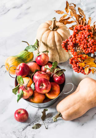 Autumn harvest - ripe red apples, pumpkins, zucchini on a light marble background, top view