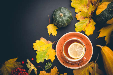 Cup of tea with autumn leaves. Top view and copy space. Halloween, Thanksgiving day or autumn background