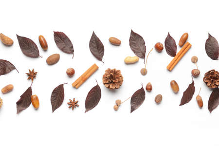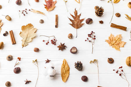 Autumn flat lay. Fall leaves, berries, acorns, walnuts, cinnamon,anise , cotton and pine cones on white background. Minimalistic autumn natural pattern