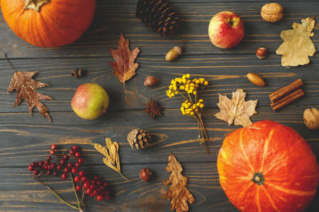 Pumpkins, autumn leaves, apples, anise, cones, acorns and berries on dark wooden background. Happy Thanksgiving greeting card. Fall harvest on rustic wood flat lay.