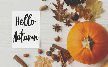 Hello Autumn text on greeting card and pumpkin, autumn leaves, anise, pine cones, acorn on wooden background. Creative modern autumnal postcard. Welcome Fall