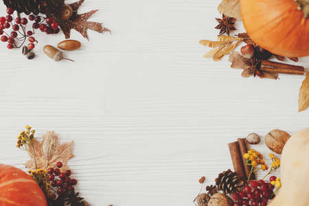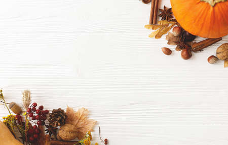Autumn flat lay. Pumpkins, anise, cinnamon, acorn, nuts and autumn leaves on white wood. Autumnal seasonal greeting card, space for text. Happy Thanksgiving concept