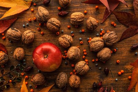 Apple and walnut, autumn abundance - healthy organic fruit on wooden table decorated with colorful maple leaves and berries, top view