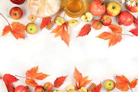 Happy Thanksgiving concept, greeting card. Autumn background with seasonal maple leaves, apples, honey on light background, banner for screen, invitation, Jewish New Year Rosh Hashanah, selective focus, top view, flat lay.