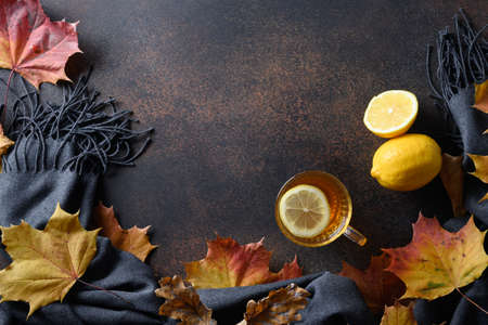 Warming tea with lemon in cozy lifestyle with fall leaves and cozy scarf on brown background. View from above with copy space.