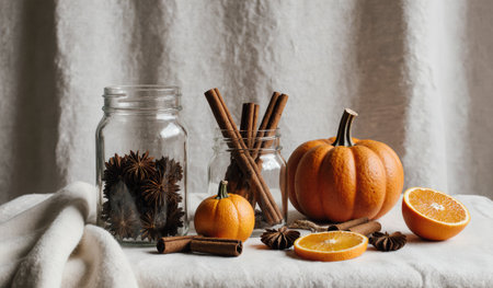 A cozy table setting showcases vibrant pumpkins, cinnamon sticks, and star anise. A slice of orange adds a pop of color, evoking the warmth of autumn evenings.