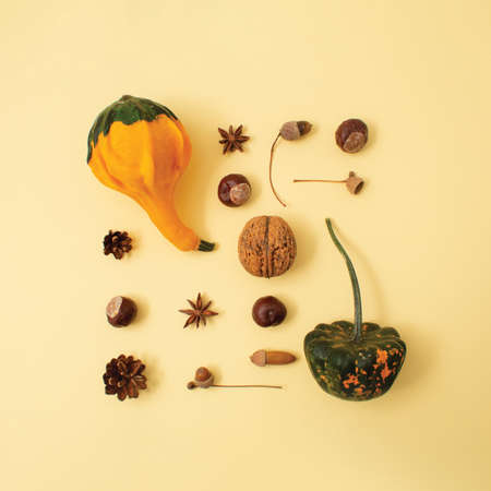 Autumn floral arrangement, composition with decorative pumpkins and yellow leaves, chestnut, pine cones template for Thanksgiving and fall holidays, conceptual flat lay