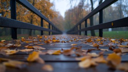 A low-angle perspective captures a wooden bridge deck strewn with vibrant fallen leaves, leading into a misty, autumnal forest.