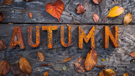 The word autumn is spelled out in orange wooden letters, lying on a rustic wooden surface. Scattered around the letters are fallen leaves of various shades of brown.