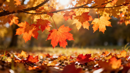 Beautiful autumn scene displays vibrant maple leaves in various shades of red and orange, illuminated by sunlight, gently falling on the ground, creating a stunning image of fall's beauty.