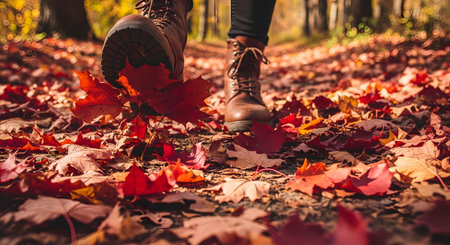 A low-angle, close-up shot of a person's feet, wearing brown hiking boots, walking on a forest path covered in fallen red and orange maple leaves. The person is mid-stride, kicking up a red leaf. This image captures the essence of hiking in autumn.