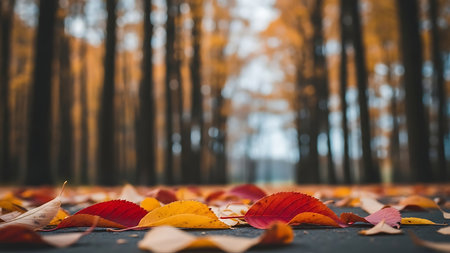 Vibrant fallen leaves in shades of red, yellow, and orange are scattered across a weathered wooden surface, bathed in warm, golden sunlight, capturing the essence of a crisp autumn day.