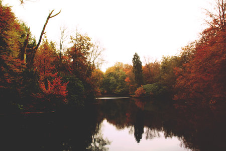 Autumn landscape with a lake and trees in beautiful autumn colors in yellow and orange in the fall with autumn leaves in the dark water