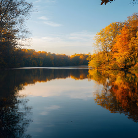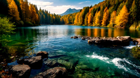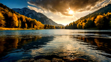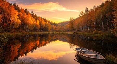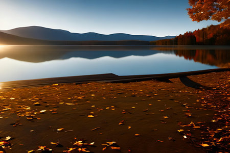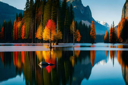 Stunning autumn lake reflecting colorful trees and mountains at sunset. Peaceful and serene.