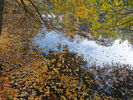 A willow with bright autumn leaves growing over a pond in which trees and the sky are reflected, in a park on Elagin Island on a warm autumn day.