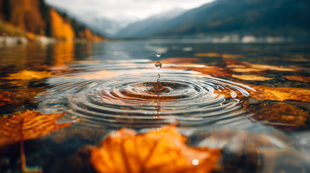A single droplet disturbs a tranquil lake, sending gentle circles outward amidst a tapestry of brightly colored leaves, with misty peaks softly fading behind.