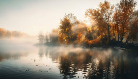 Misty morning on an autumn river. Golden sunlight filters through the trees, creating a magical atmosphere.