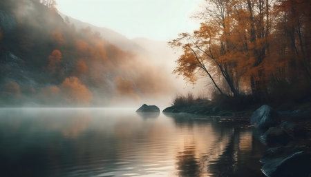 Serene autumn scene of a river reflecting misty mountains and golden trees.