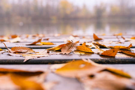Wet fallen leaves on a wooden platform for fishing against the background of the river. high quality photo