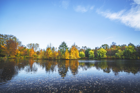 Autumn landscape with lake and trees in the park. Colorful foliage on the lake.