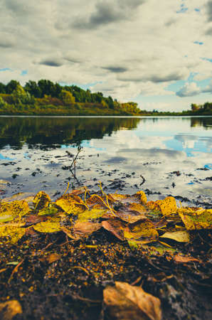 Beautiful autumn landscape with lake and trees. Fall season concept.