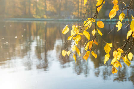 Branch of a tree with yellow leaves above the water of a lake on a sunny autumn day. Scenic landscape of golden foliage on trees. Reflection of picturesque view in the lake.Change of season.