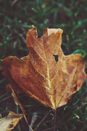 Beautiful old aged torn yellow orange red autumn maple leaf on green grass fall season, macro shot view from above, toned with retro vintage faded film effect filters