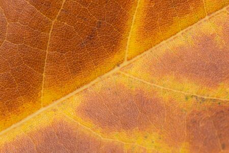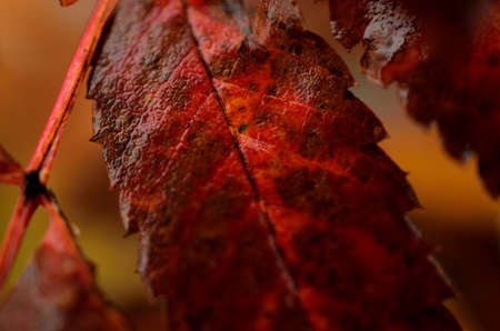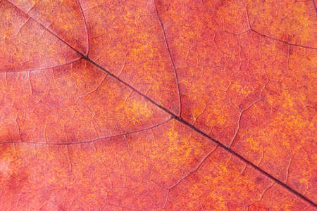 Background image of autumn foliage. Texture of an orange leaf with veins close up