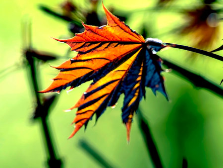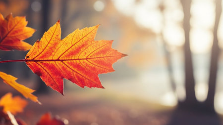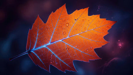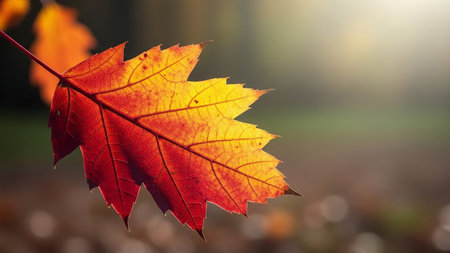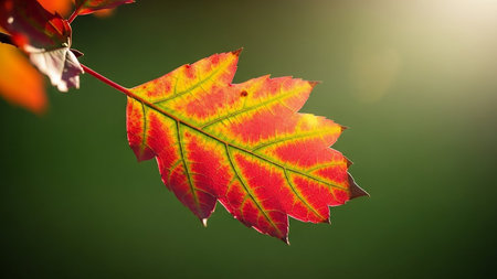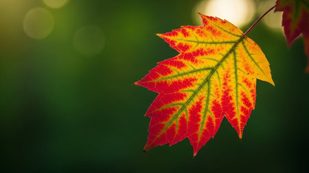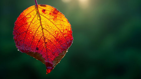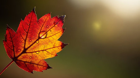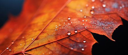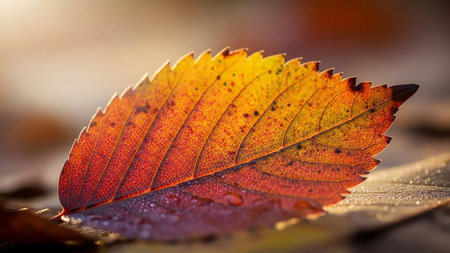 Close-up shot of a vibrant maple leaf glistening with morning dew. Rich autumn colors and intricate details are beautifully captured