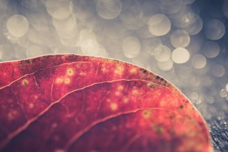 isolated red leaf on a grey background with amazing bokeh light. autumnal concept.