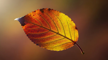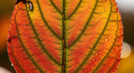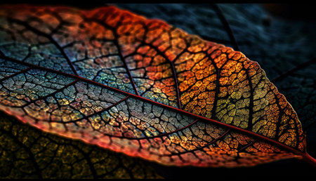 A stunning macro photograph of an autumn leaf. Rich colors and detailed textures are showcased.