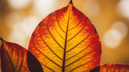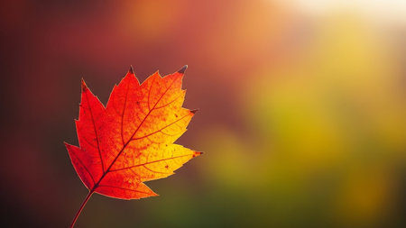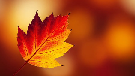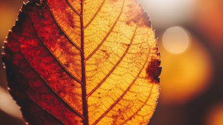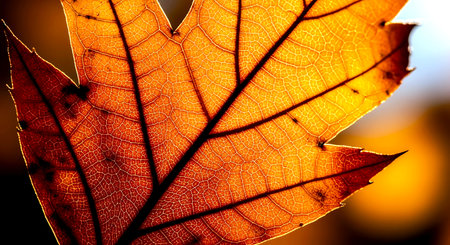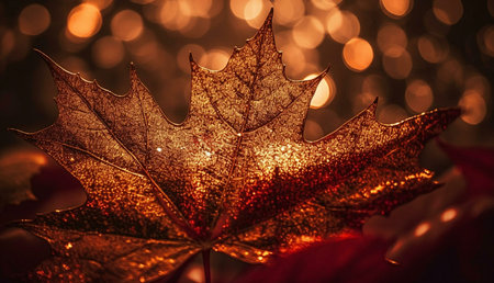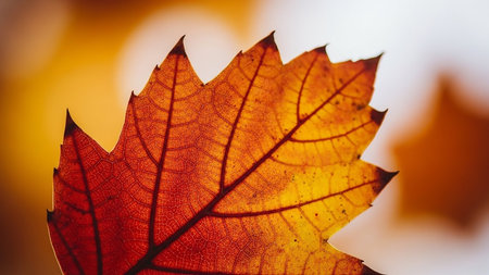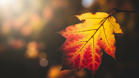 A stunning close-up of a backlit maple leaf, showing its intricate details and autumnal colors. The bokeh effect adds a magical touch.