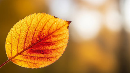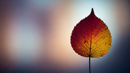 A captivating close-up of a single maple leaf, glistening with dew drops. Autumnal colors shine through.