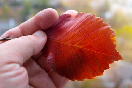 Autumn orange leaf in woman hand. Floral seasonal concept background. Elm red leaves