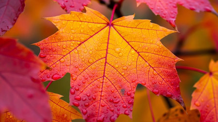 Vibrant autumn maple leaves with water droplets close up