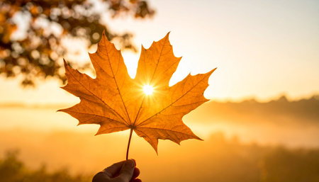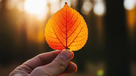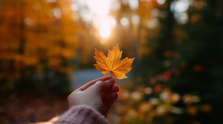 Holding a vibrant maple leaf during sunset in a serene forest atmosphere with golden hues