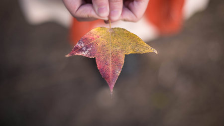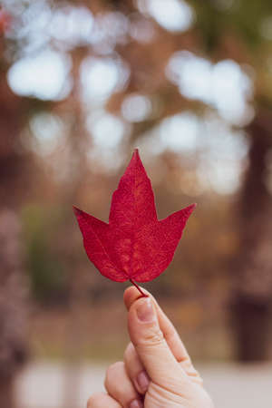 Thanksgiving Day in Canada, Hand holding red autumn leaf closeup. Maple fall leaves in park. Hello October concept. Nature change mood.